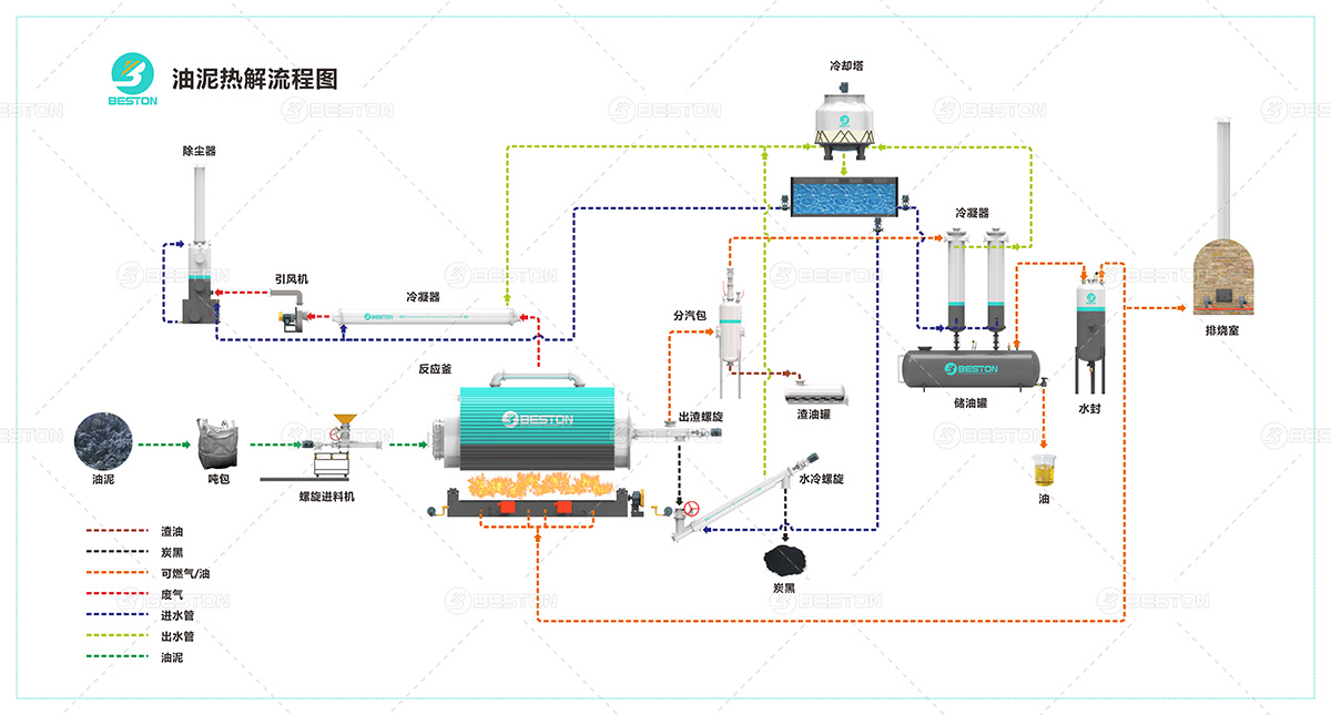 全連續油泥熱解煉油設備由反應釜、驅動系統、取樣器、螺旋除渣器、汽包系統、靜電除塵器、水冷出渣機、油氣冷凝系統、水冷炭黑儲存罐、螺旋進料機、稱重機、料倉等幾部分組成 ;間歇/半連續油泥熱解煉油設備由引風機、煙道冷凝器、排燒室、汽包和渣油罐、三合一冷凝器、出料系統、驅動系統、裂解主爐、液壓進料機構、除塵塔等幾部分組成。
