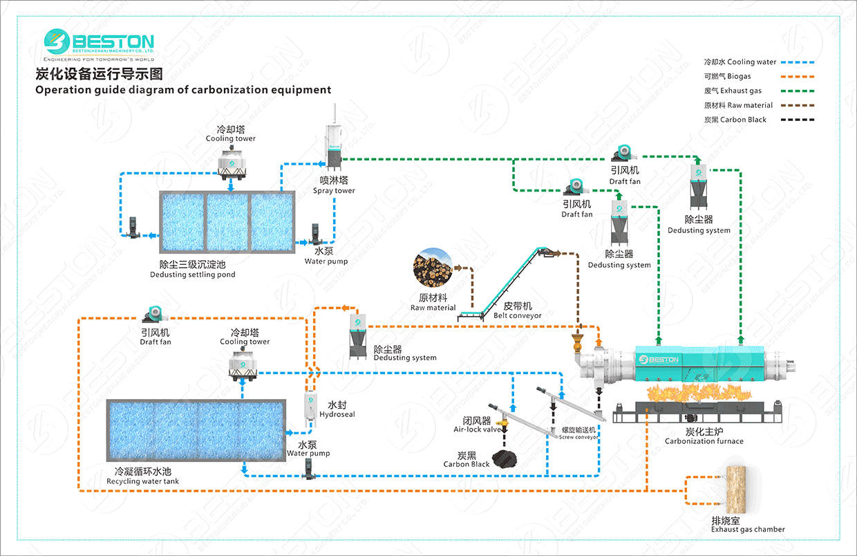 污泥碳化由烘干爐(非必選)、炭化主爐、冷凝器(非必選)、冷卻塔等部分組成; 炭化主爐由主滾筒、機殼、燃燒室等部件組成
